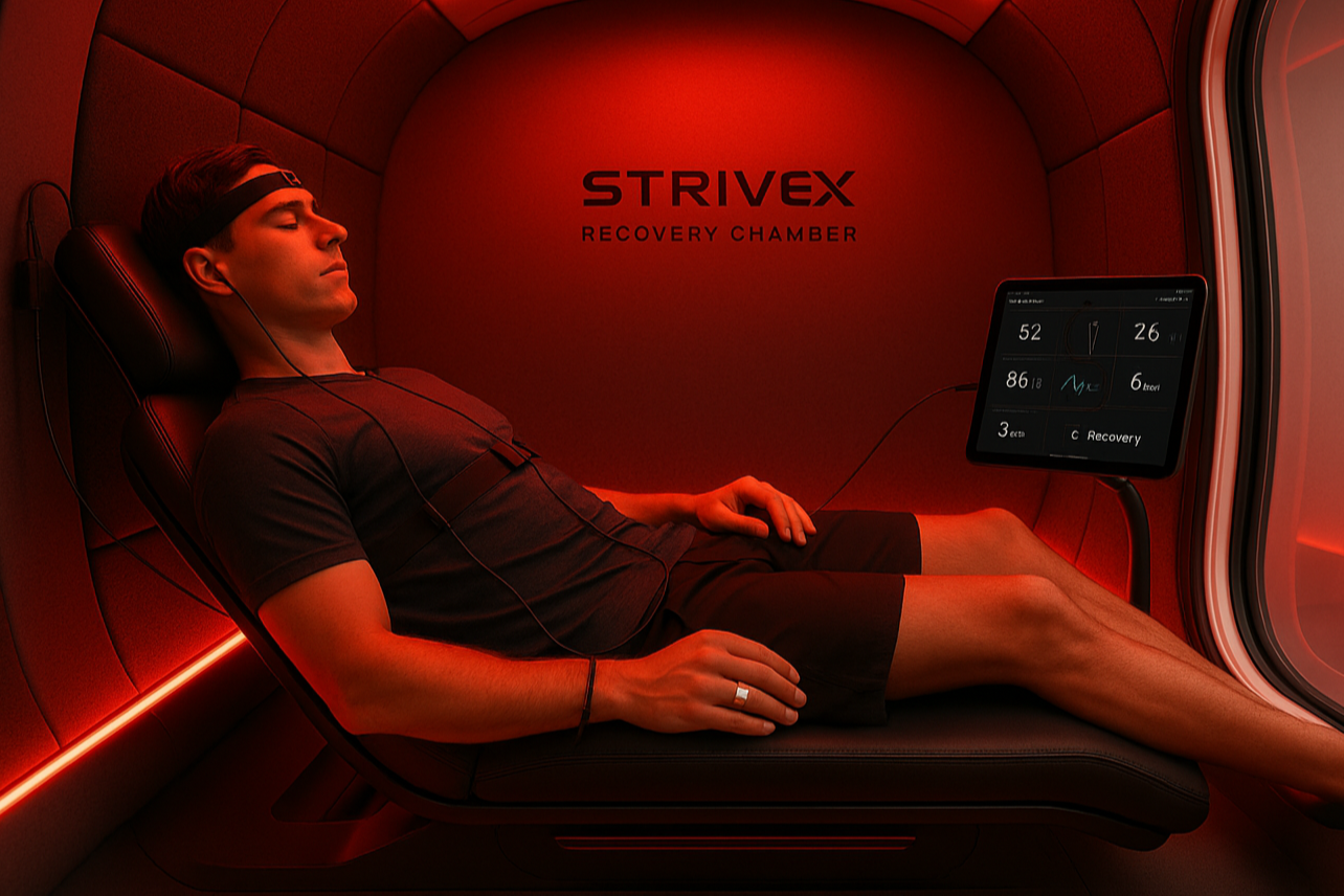 De StriveX Recovery Chamber is ontworpen voor de volgende generatie atleten. Een ruimte waar technologie en fysiologie elkaar versterken, met realtime herstelmetingen, AI-analyse en fysieke optimalisatie.